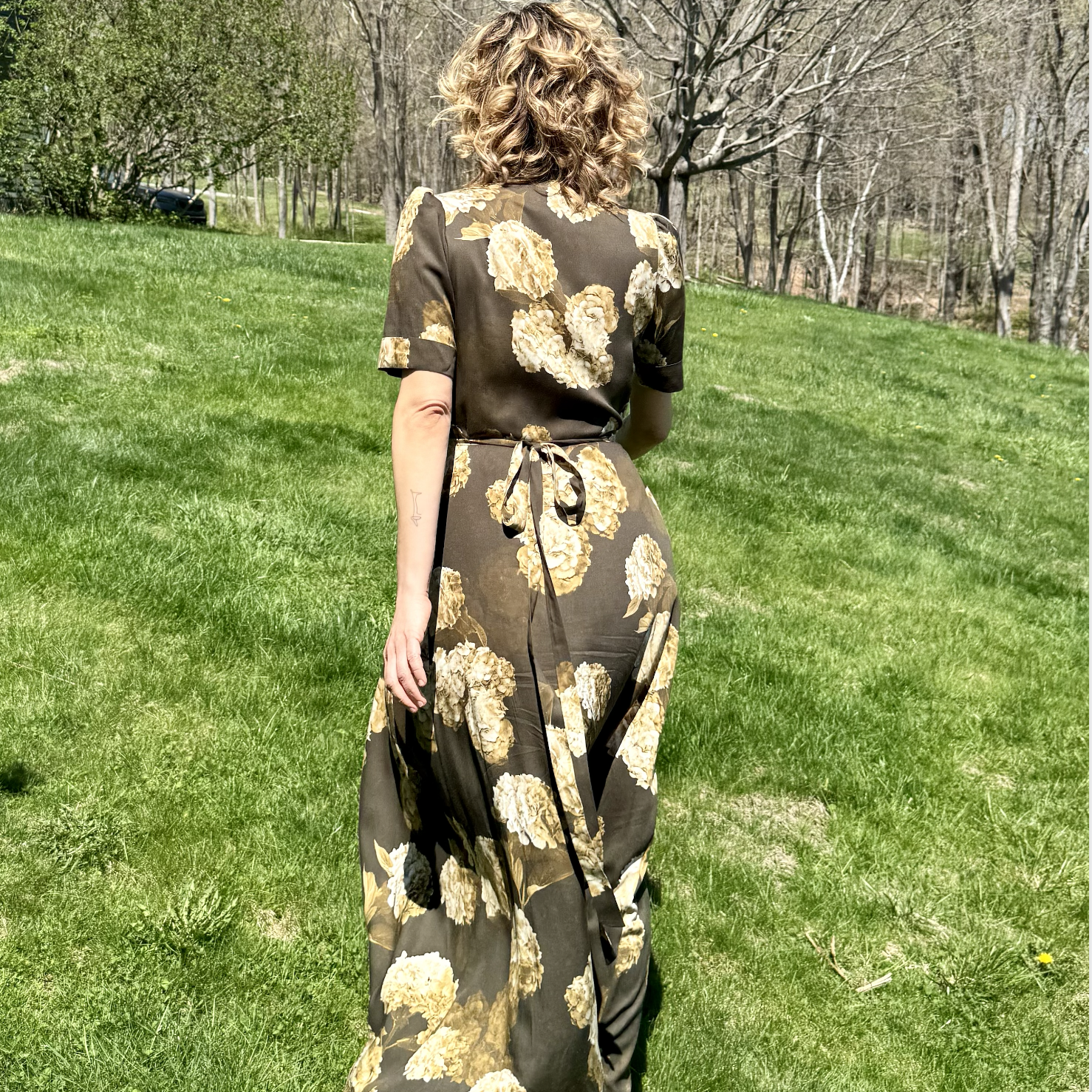 The G.Mol OG Dress is a head-turning addition to your leisure wear. The beautiful and original sepia toned hydrangea print looks dramatic lounging by the pool, or is perfect for those times when you want to feel presentable without actually getting dressed. An elegant robe style dress with a single interior tie, it boasts an extra long sash which can be tied at the back, or double wrapped at the side. You will reach for this frock morning afternoon and evening. The fabric is soft and unstructured, but the collar and signature puff at the sleeve, will keep this look elevated and elegant. A stunning 1940's silhouette.