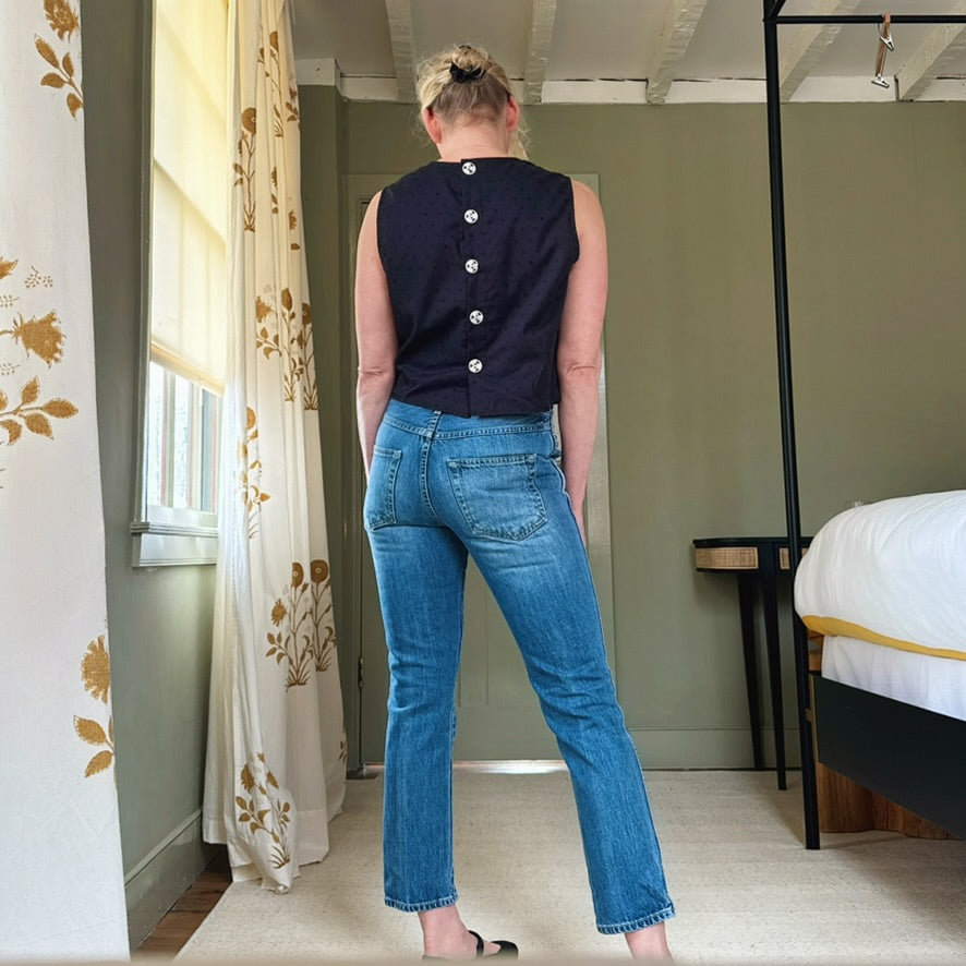The tank is equally special, finished with a row of unique buttons down the back that turn a simple top into a true conversation piece. Thoughtfully designed to be worn together or styled separately, this set instantly multiplies your outfit options—pair the tank with jeans or tailored pants, or wear the skirt with a crisp tee, knit, or blouse. It’s the kind of versatile, beautifully made piece you’ll reach for again and again—because once it’s in your closet, you’ll realize you had nothing quite like it before.