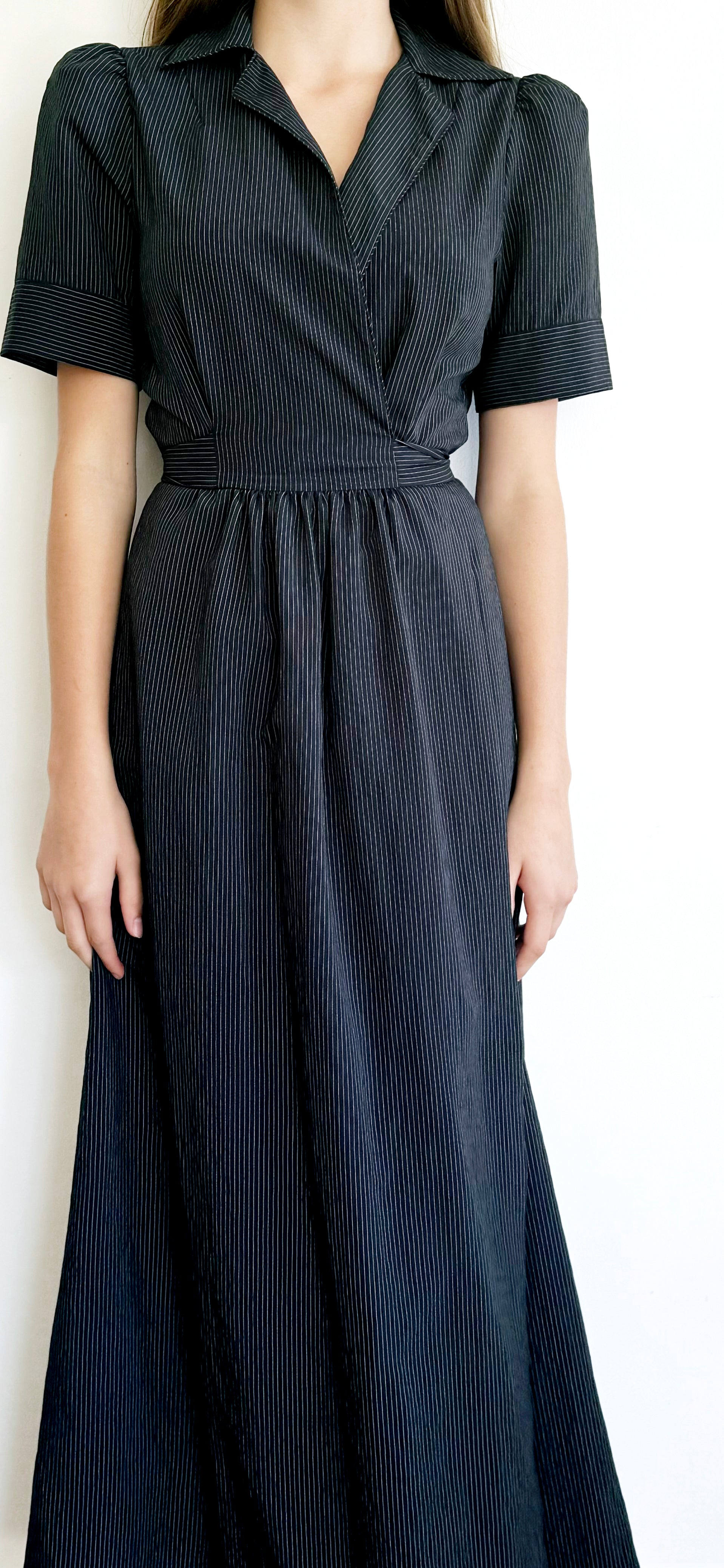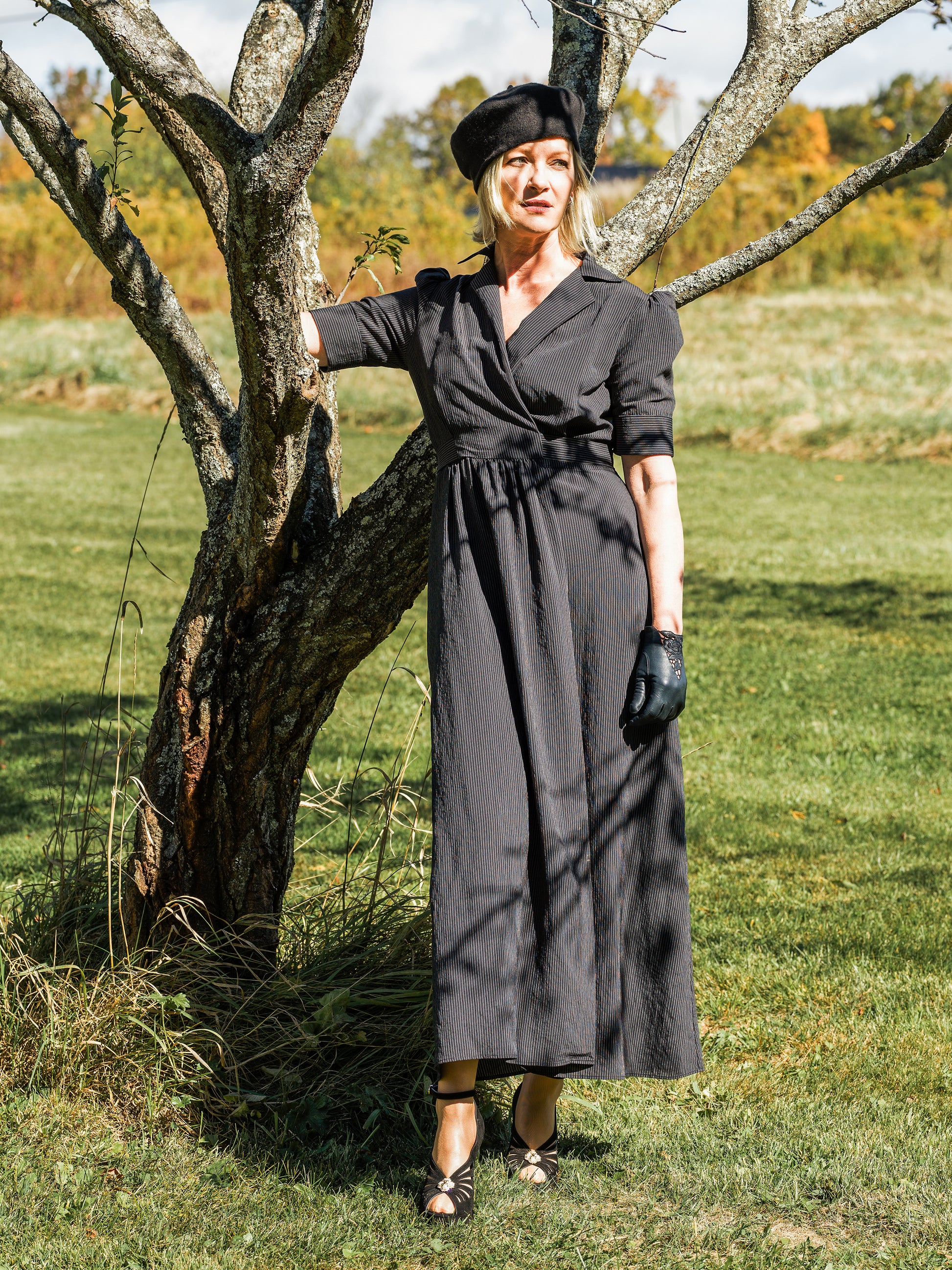 The Crusader steps into frame, with purpose. With a midnight background and subtle vertical pinstripe running through, she is sharp and tailored. Her dramatic silhouette suggests a fearless confidence, while the subtle puff at the shoulder offers a nod to her feminine edge in an effortless, casual way. The Crusader is comfortable in the boardroom or on the back roads, as long as she’s leading the charge.